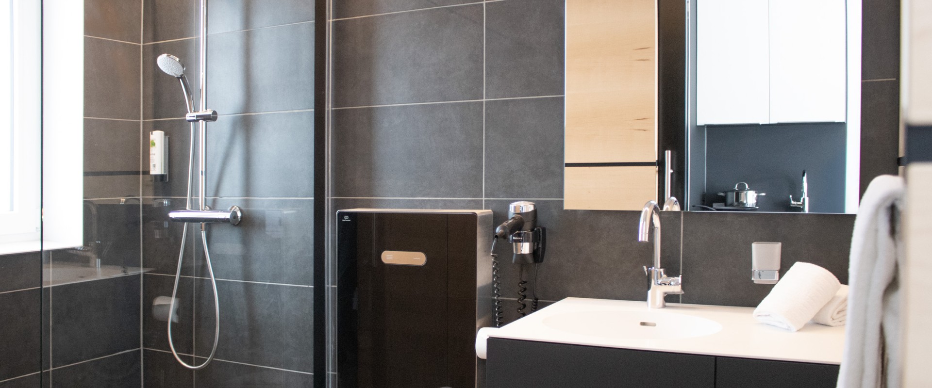 Begehbare Regendusche, Waschbecken, Föhn